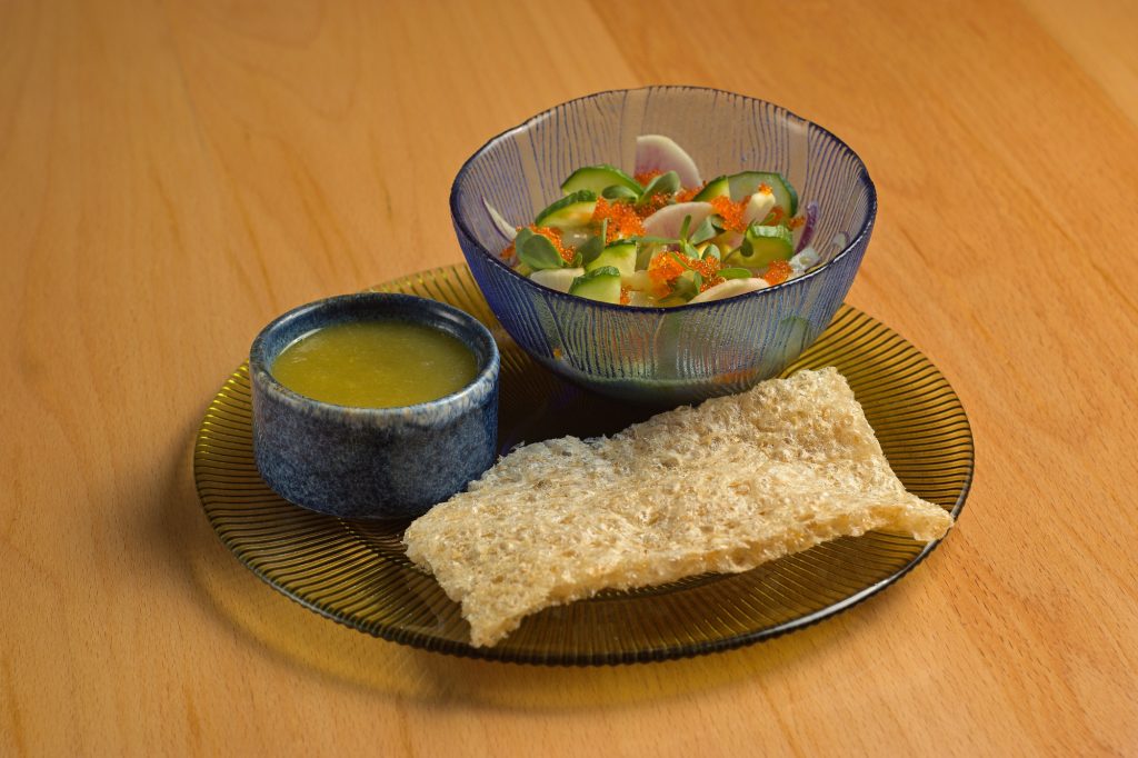 El espacio está pensado para incomodar a quienes esperan decoraciones sobrias y conceptos prefabricados. Aquí hay viniles en las paredes, cuadros que aluden a Asia pero con una curaduría visual que grita: esto es distinto. Y lo es. No hay intención de replicar la tradición japonesa de forma ortodoxa. Hay, en cambio, un deseo claro de resignificarla desde México, desde una cocina que entiende que la migración no es fusión sino tránsito, adaptación y creatividad.